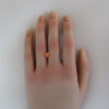 A brilliant orange radiant trillion cut lab-created sapphire weighing in at 1.55 carats. It measures 7.15mm x 4.56mm deep.
